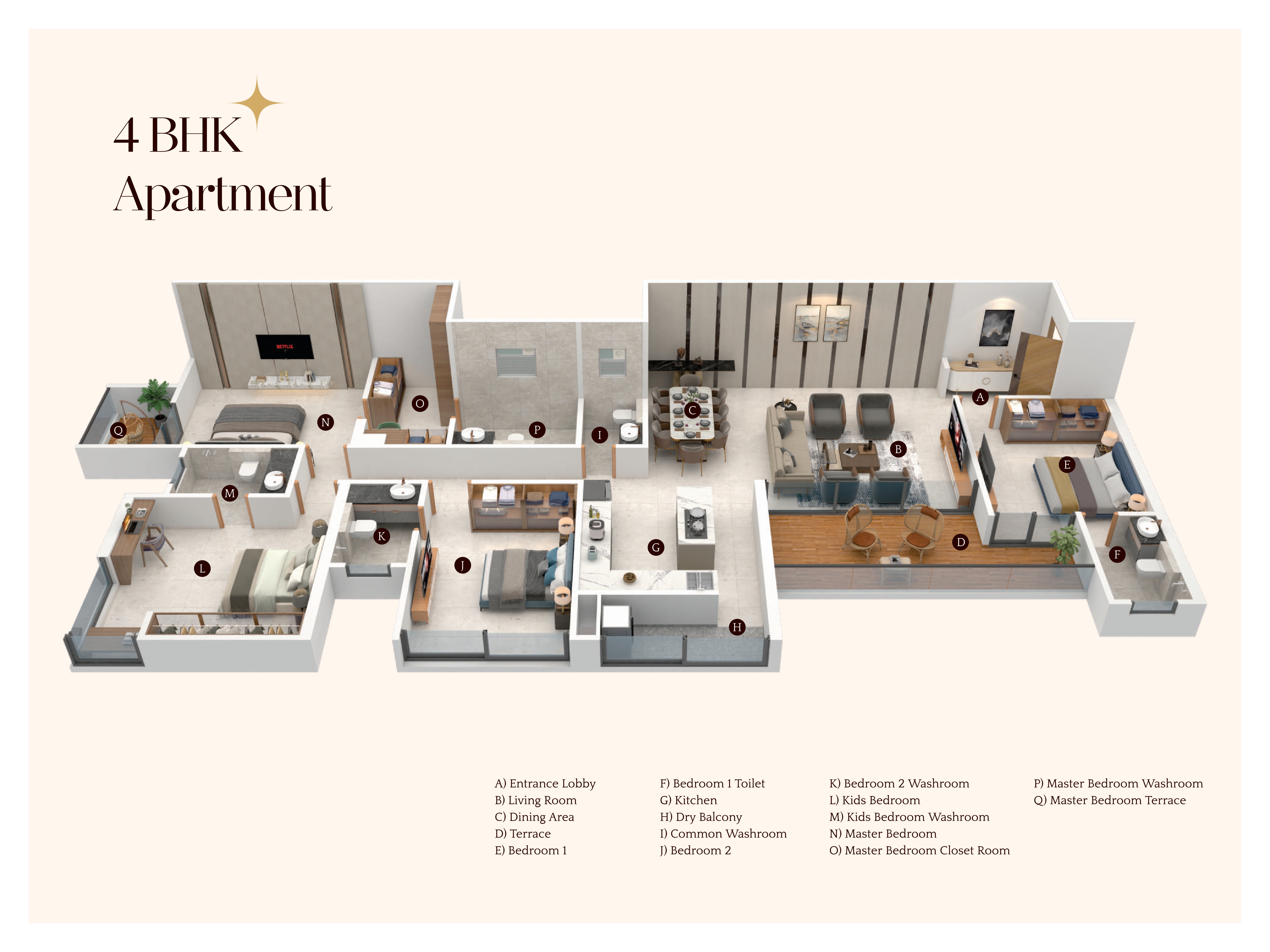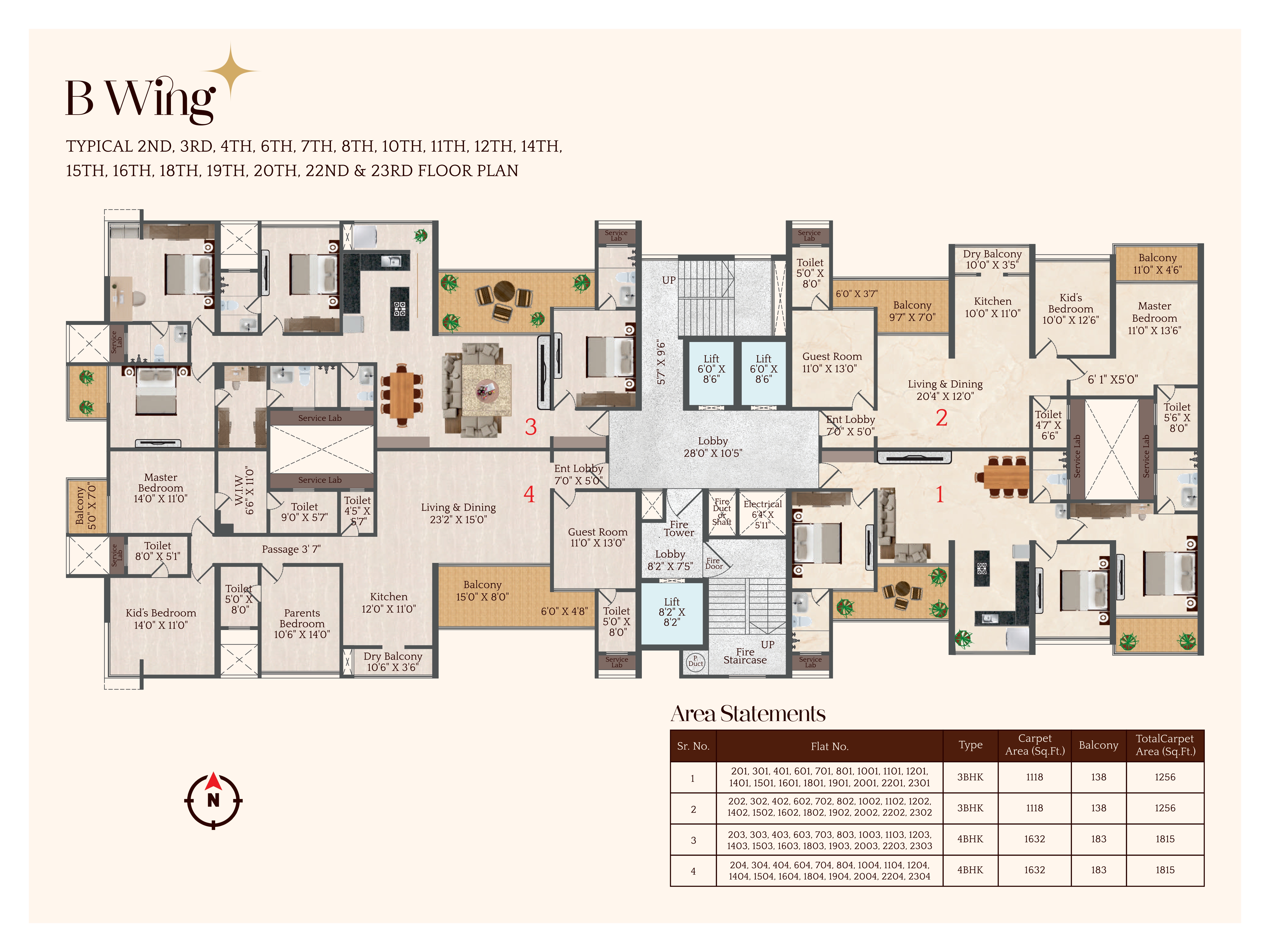 Total Carpet Areas: 1256 Sq.Ft. for 3BHK to 1815 Sq.Ft. for 4BHK - designed to provide ample space for comfortable, luxurious living.